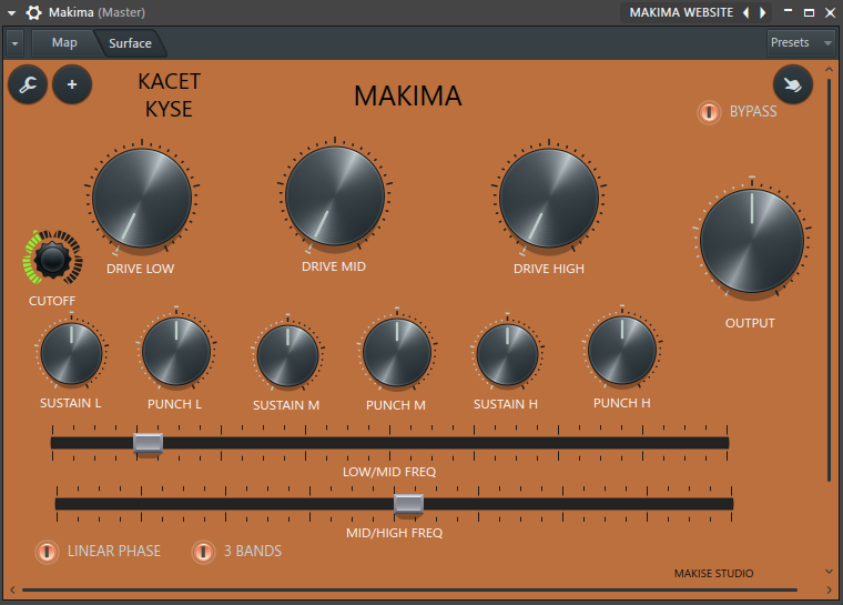Makima offers two different operating modes, allowing you to switch between 2-band and 3-band saturation, letting you tailor the effect to suit different musical needs. With the ability to engage linear phase processing, you can avoid phase issues at the crossover points, ensuring that every layer of your sound is tight, clear, and harmonically rich.
